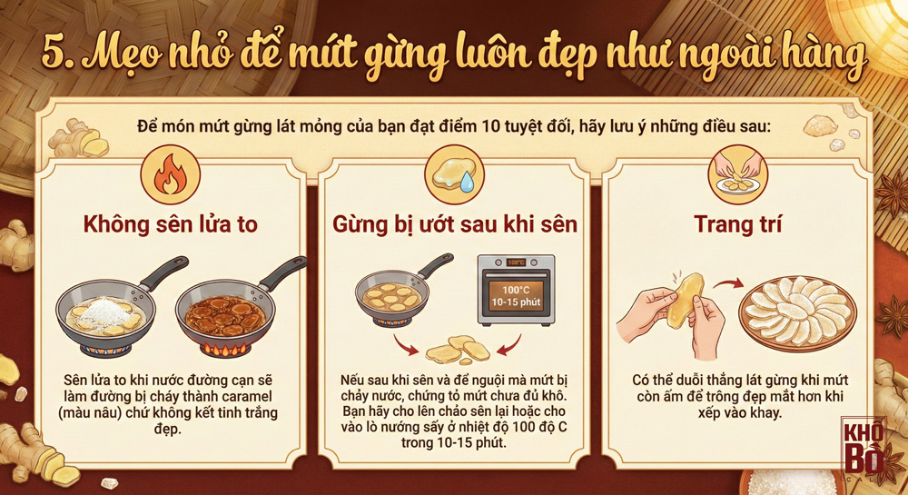Để món mứt gừng lát mỏng của bạn đạt điểm 10 tuyệt đối, hãy lưu ý những điều sau: