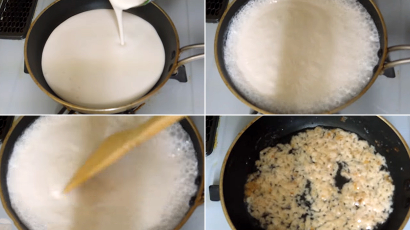 Bạn bắc 250ml nước cốt dừa vào chảo, khi hỗn hợp sôi lên thì bạn dùng giá khuấy đều và hạ lửa nhỏ xuống. Bạn tiếp tục đảo đều đến khi ra dầu và cái chuyển sang màu trắng vàng thì tắt lửa.